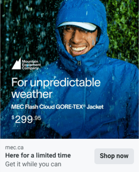 As we got into the rain season, the Outerwear campaign allowed MEC to highlight its warmth, durability, and style to encourage customers to purchase new outerwear for the fall and winter seasons.